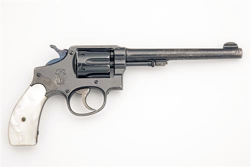 late second, early third model with 6 1/2in. barrel, the top signed and with patent dates to 1906, crescent fore-sight, sighting groove to the top-strap, swing-out fluted cylinder, mother of pearl grips (probably factory), the whole with a strong amount of finish