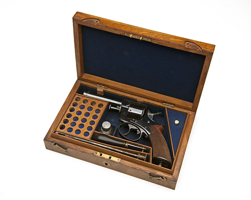 circa 1880, with blued ovoid 4 1/2in. barrel (marked around fore-sight), sighting groove to top-strap, flush fitting ejector crane around barrel, blued stepped frame marked 'WEBLEY'S PATENT', plain blued six-shot cylinder with front locking notches, brushed bright hammer and trigger, chequered walnut semi saw-handled one-piece grip, lanyard ring at pommel and guarded trigger, the whole retaining virtually all its factory bued finish except where noted and complete with an unlabelled English market oak storage case compartmented and lined in blue baize with provision for ammunition and including a turn-screw, oil-bottle and cleaning rod