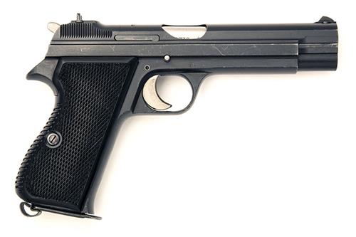 circa 1985, with 4 1/2in. barrel, blacked slide and frame, the top of slide marked with a Swiss cross in a shield, chequered black plastic grips and heel magazine release, the whole appearing little used