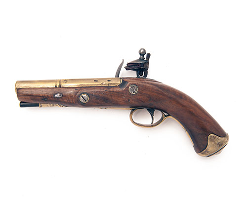 circa 1790, with probably shortened two-stage 5 1/2in. brass barrel, moulded band and engraved stars at intersection, borderline engraved breech, the top-flat at breech engraved 'CUSTOMS', London proofs, solid iron top-tang (cracked and repaired), flat, borderline engraved bevel-edged lock signed 'BARNETT', martial trophy engraved forwards of the clipped and stepped tail, replacement hammer, roller frizzen, later walnut full-stock re-using the original brass furniture and replacement ramrod
