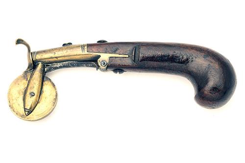 circa 1760, with tapering borderline engraved brass body with small diameter internal powder chamber, spurred and hinged muzzle-cover operating on an under-slung wheeled scale with under-body tension spring, walnut butt with swollen bag-shaped grip and top-mounted priming well