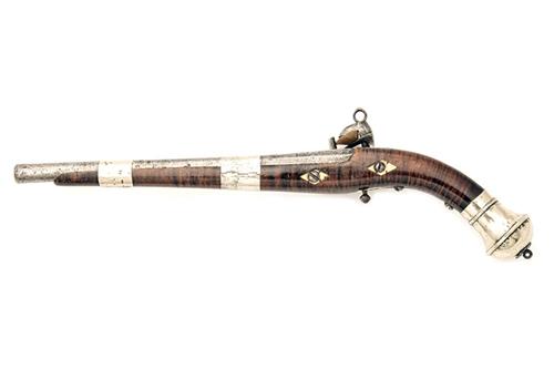 Southern Russia or Corsican circa 1790, with 12 1/2in. iron barrel, semi octagonal form breech-section with arabesque engraving (rubbed), plain miquelet lock with small ring top to the hammer, solid top-tang with integral back-strap, figured walnut three-quarter stock, substantial domed white-metal pistol-grip cap with central iron rosette and lanyard swivel, bone escutcheons to the back-strap and side nails, further bone escutcheon to the guardless ball trigger and two broad plain white-metal barrel-bands, no provision for ramrod