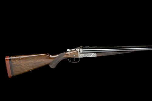 30in. Greener trade mark nitro barrels, broad raised matt rib with banner engraved 'W. W. GREENER, MAKER. 40. PALL MALL. LONDON. WORKS. BIRMINGHAM', fluted at the breech end and engraved with a Blue Rock pigeon, the breech ends of the barrels engraved with bands and acanthus ornamentation, 2 3/4in. chambers, bored approx. 1/2 and 3/4 choke, treble-grip action with flat matt top standing breech, Southgate ejectors, manual side-safety with gold-inlaid 'SAFE' detail, bold floral and acanthus scroll engraving, the makers name in a scrolling banner, 15 1/4in. figured pistolgrip stock (cracked at hand) with horn pistolgrip-cap and including 1 1/4in. rubber recoil pad, fore-end with Deeley & Edge patent release catch and horn finial, weight 7lb. 15oz., in its lightweight canvas and leather case with some accessories and gold-tooled red leather trade label
