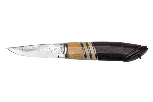 3 1/2in. hi-carbon stainless-steel blade by Mattias Styrefors with highly polished cutting edge, the blade sides finished with a naturalistic texture, the front part of the hilt with a white metal bolster joined to a stained reindeer antler section with three white-metal bands, the remainder of stabilised amboina, stud pommel and complete with its moulded and embossed leather scabbard with suspension loop, unused