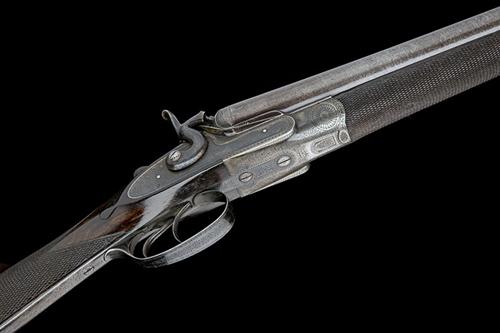 29 5/8in. black powder only bold damascus barrels, rib engraved 'E. & F.G. DODSON 14 UPGATE. LOUTH.', 2 1/2in. chambers, bored approx. true cyl. choke in both, Thomas patent action, patent no. 324 of February 4th 1870, carved percussion fences, broad toplever, rebounding sidelocks with dolphin hammers, floral and acanthus scroll engraving, retaining much renewed colour-hardening, 14 1/4in. figured stock with engraved steel heel and toe plates, fore-end with early Anson push rod release, patent no. 953 of 1873, use number 454, weight 6lb. 12oz.
