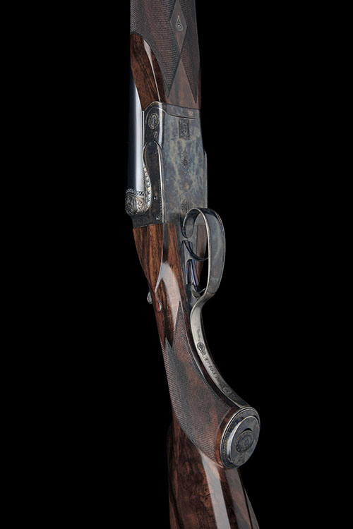 23 3/4in. nitro chopperlump barrels with file-cut sight rib gold-inlaid with the calibre designation, open sights and two folding leaf sights marked '100' and '200' and with gold-inlaid sight lines, ramp-mounted bead fore-sight, the ramps engraved with bold leaf motifs, bolstered treble-grip action with hidden third bite and side-clips, removable striker discs, automatic safety, elongated top strap, articulated front trigger, double rolled-edge triggerguard, the bolsters and fences engraved with bold acanthus scroll and leaf motifs, retaining much original colour-hardening, 14 7/8in. highly-figured pistolgrip stock with cheekpiece, engraved and colour-hardened steel pistolgrip-cap (with trap), sling swivels, including 7/8in. leather covered recoil pad, beavertail fore-end, weight 9lb. 13oz., in its fitted elephant-hide case with accessories, Lebeau-Courally certificate and Liege proof certificate