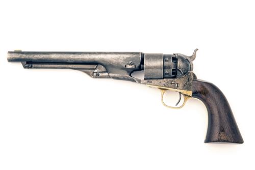 for 1863, with 8in. round, sighted barrel signed 'ADDRESS COL. SAML COLT NEW-YORK U.S. AMERICA', plain stepped cylinder roll engraved with traces of a naval scene, open iron frame marked 'COLT'S PATENT', recoil shield cut for shoulder-stock, brass trigger guard stamped '.44 CAL' traces of silver plating and iron backstrap, the heel with cut-out for stock, some refinishing throughout, miss-numbered wedge
