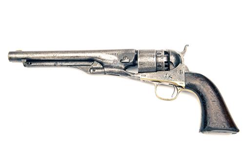 for 1862, with round 8in. barrel, the top signed 'ADDRESS COL SAML COLT NEW-YORK U.S. AMERICA' (faint), blade fore-sight, London proofs, stepped cylinder with a roll-engraved naval engagement scene, open frame, spurred hammer, iron back-strap, smooth walnut one-piece grip, brass trigger-guard stamped '44 CAL' (traces of silver plating) and iron under-barrel rammer, slight traces of finish in sheltered areas