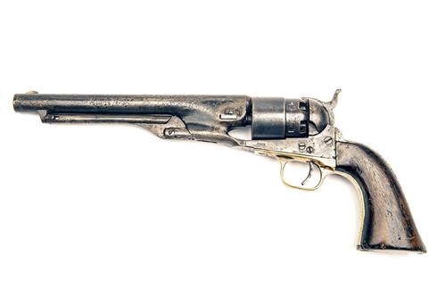 for 1861, with 8in. round, sighted barrel originally signed 'ADDRESS COL. SAML COLT NEW-YORK U.S. AMERICA' (only partially legible), amateur replacement wedge, plain stepped cylinder scrubbed of naval scene, open iron frame marked 'COLT'S PATENT', cut-outs on recoil shield and heel for shoulder-stock, brass trigger guard, iron backstrap, smooth walnut grip, refinished throughout, pitting, some deep