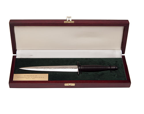 including a genuine Wilkinson Sword, London commercial example in black finish with its brown leather scabbard, three William Rodgers, Sheffield examples comprising of a 50th Anniversary of the F.S. 1941-1991 with gilded hilt and leather scabbard, a wooden boxed 'S.A.S' commemorative in black finish with applied 'winged dagger' badge and a wooden boxed '50th Anniversary of World War Two' with black hilt and polished blade (both without scabbards), the fifth and last signed 'Cooper, Sheffield' with turned wood hilt, brushed bright blade and brass hardware, complete with leather scabbard, all appearing unused
