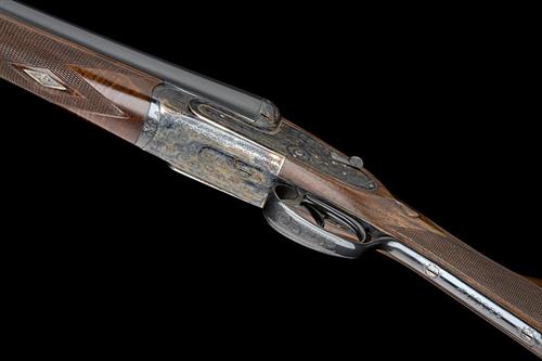 26in. nitro chopperlump barrels, 2 3/4in. chambers, bored approx. imp. cyl. and 1/2 choke, engraved arcaded fences, removable striker discs, automatic safety, hand-detachable lockplates, gold-inlaid cocking-indicators, articulated front trigger, rolled-edge triggerguard, fully engraved with acanthus scrollwork, retaining virtually full original colour-hardening and finish, 14 3/4in. stock, weight 6lb. 7oz., in a case with original paperwork