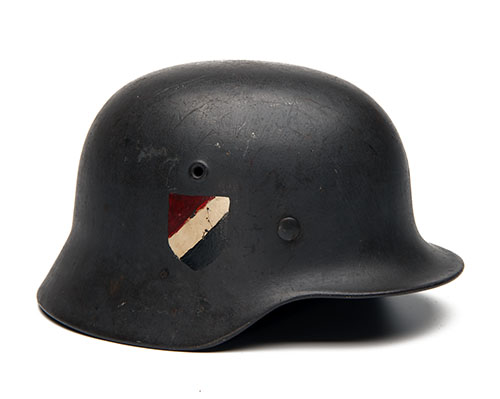 circa 1941, of classic shape with rolled edge, pressed air vents, the left hand side with Luftwaffe eagle decal, the right hand side with period overpainted national emblem, the ear-brim on left stamped inside 'ET64' (for Eisenhutten Werke, Thale), the inside of neck-guard stamped '1172', fitted with the correct leather liner (half of the chinstrap replaced) and finished in a dark blue-grey, complete with certificate of authenticity