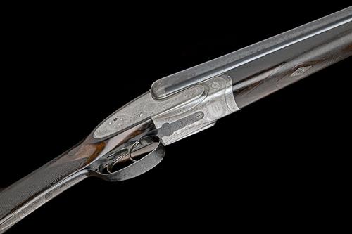 29in. sleeved nitro barrels(some external rusting), 2 1/2in. chambers, bored approx. 1/4 and full choke, automatic safety with gold-inlaid 'SAFE' detail, gold-inlaid cocking-indicators, triggers set for the left hand, fine acanthus scroll engraving with floral bouquets, the underside with 'LANG PATENT EJECTOR', bright and blued finish, 15 1/8in. figured stock, cast on for the left shoulder, weight 6lb. 11oz.
