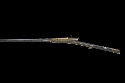 Indian circa 1830, with tapering iron 54 1/2in. barrel, the banded and flaring muzzle along with the breech-end completely covered in gold koftgari-work, large bead fore-sight, square cut standing notch rear-sight, side-mounted pan with rotating cover, applied iron panels behind the breech with gold koftgari borders, walnut full-stock with narrow angular tiller butt, the iron sideplates and trigger-plate with gold koftgari borders, iron butt-cap with arabesque-shaped side-pieces and further gold koftgari borders, fully en-suite trigger-blade, three pairs of narrow white-metal barrel-bands with embossed floral rosettes to the tops, iron horseshoe swivels and gold koftgari decorated iron ramrod