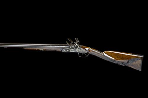 probably French or Belgian circa 1800, with 35 1/4in. iron barrels engraved with bordered arabesques to both breech-ends, running vine engraved to the narrow rib at breech, bead fore-sight, sighting groove to front of the vase-shaped top-tang, flat bevel-edged floral-scroll engraved locks (sears at fault on both), the engraving repeated on the fronts of both frizzens and hammers, basketweave chequered walnut half-stock with carved and moulded raised cheek-piece, engraved cap-type heel-plate, the underside of wrist carved with the mask of a 'green man' with applied glass eyes, carved and engraved trigger guard bow and tang, the chequered panel at the fore-end inlet with a white-metal abstract engraving of a tear-drop terminating in a fish head, moulded and engraved ramrod throat combined with the fore-end cap, roll ended ramrod thimble (only one remaining) and replacement wood ramrod