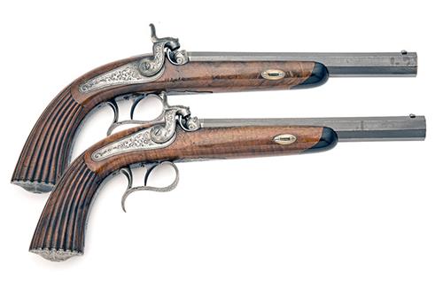 circa 1860, with octagonal iron 9in. barrels signed in gilt on the top-flats 'J. ROESSLER IN CARLSRUHE', dove-tailed blade fore-sights, scroll engraved breeches, adjustable standing notch rear-sights to the scroll engraved top-tangs, carved fenced and engraved snails, borderline and scroll engraved back-action locks and hammers, walnut half-stocks with fluted butts, engraved butt-caps with truncated spires, spurred trigger-guard bows and horn fore-end tips, the pair contained within their makers walnut storage case, lined and compartmented in the continental style with dark green baize and with a full complement of original accessories including a scissors mould, loading mallet, cleaning rod, nipple-key, turn-screw, powder-flask, adjustable measure and double ended wood barrel for caps and patches