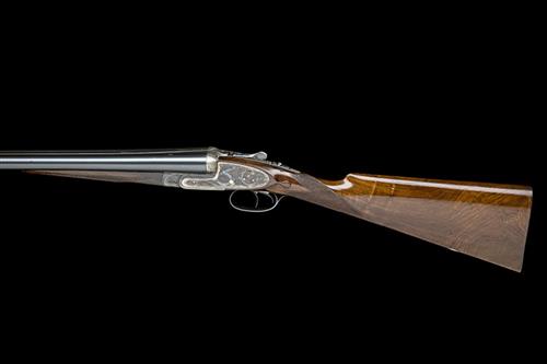 28in. nitro chopperlump barrels, 2 3/4in. chambers, bored approx. 1/4 and 3/4 choke, removable striker discs, automatic safety, gold-inlaid cocking-indicators, articulated front trigger, rolled-edge triggerguard, fine acanthus scroll engraving with floral bouquets, retaining much original colour-hardening and finish, 14 5/8in. figured stock, weight 6lb. 8oz.