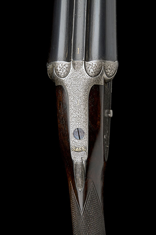 29in. nitro reproved Whitworth-steel chopperlump barrels (loose on action), the rib engraved in gothic script 'THE AUTOMATIC' and 'JAMES WOODWARD & SONS. 64 ST. JAMES'S. LONDON. MADE OF SIR JOSEPH WHITWORTH'S FLUID PRESSED STEEL', and gold-inlaid '1' at the breech end, 2 1/2in. chambers, bored approx. imp. cyl. and 1/4 choke, push-forward underlever (stiff), T. Southgate and J. Woodward patent 'Automatic' lever-cocking action, patent no. 600 of 1876, use number 604, incorporating T. Perkes patent ejectors, patent no. 12176 of 8th September 1887, use number 418, removable striker discs, side-clipped arcaded fences, the top-strap gold-inlaid '1', automatic safety with gold-inlaid 'SAFE' detail, protruding tumbler pivots with gold-inlaid cocking-indicators, best fine border and floral scroll engraving, brushed finish, 14 3/8in. highly-figured stock with Prince of Wales semi-pistolgrip with pistolgrip-cap and including horn buttplate, weight 6lb. 6oz.