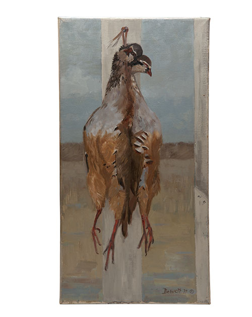 DRUIE BOWETT (1924-1998) A SET OF THREE ORIGINAL OIL ON CANVAS PAINTINGS OF HANGING GAME,