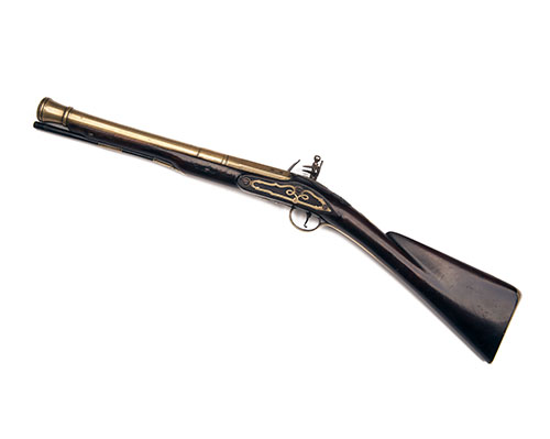 circa 1785, with triple-stage 15 1/2in. barrel banded at the intersections, off-set cannon muzzle, London proofs to the octagonal breech and iron top-tang, flat border engraved bevel-edged lock signed 'KETLAND & CO', floral engraving to the tail, unbridled frizzen, walnut handrail full-stock with exposed muzzle, rococo apron carved around the top-tang, engraved brass furniture including spurred heel-plate and pierced ribbon side-plate, acorn finial and replacement ebony ramrod