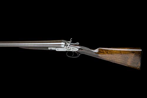 30in. black powder only damascus barrels, rib engraved 'WILLIAM MOORE & GREY. 43 OLD BOND STREET. LONDON. W.', and '2' at the breech end, 2 1/2in. chambers, bored approx. 1/4 and imp. cyl. choke, some heavy pitting, later conversion to ejector, treble-grip action with carved fences, rebounding sidelocks, border and acanthus scroll engraving, brushed finish, 14 3/8in. figured stock including buttplate, weight 6lb. 9oz.