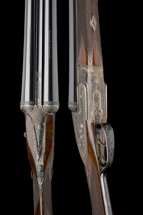 28in. nitro barrels, ribs carved with acanthus scrolls and gold-inlaid '1' and '2' at the breech ends, the tubes engraved 'HOLLAND & HOLLAND 13, BRUTON STREET, LONDON.', 2 1/2in. chambers, bored approx. imp. cyl. and 1/2 choke (No.1) and 1/4 and 3/4 choke (No.2), toplevers gold-inlaid '1' and '2', automatic safeties with gold-inlaid 'SAFE' details, hand-detachable lockplates, gold-inlaid cocking-indicators, best bold acanthus scroll engraving, the undersides with elaborate cartouches engraved 'THE BADMINTON', retaining virtually full original colour-hardening and finish, 15 1/2in. figured stocks including 3/4in. rubber recoil pads, weight 6lb. 11oz., in a brass-cornered leather case with gold-tooled Holland & Holland trade label