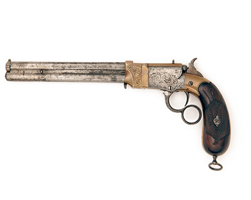 Other Notes: This pistol was the brainchild of gunmaker Pietro Antonio Venditti of Torre Annunziata and Napoli, (1828 - 1878), who, on his release from prison after doing hard labour for murder returned his hand to gunmaking. Venditti filed many patents during his lifetime with this being his most successful design, unfortunately only to have it stolen and copied whilst in prison by Horace Smith and Daniel B. Wesson (of S&W fame) and then in turn by New Haven Arms in the form of the Volcanic (q.v). Therefore this pistol could be rightfully termed the father of the Winchester rifle. Not many examples exist with the total estimated production only being around 100 pieces. Most surviving examples are made for ten shots as represented here but variations of up to twenty-six shots are known. See "Der Neue Stockel", Vol. II, page no. 1324.