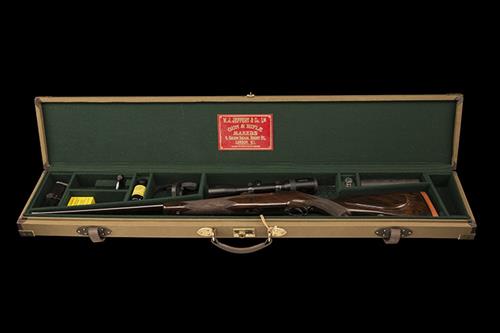 23 3/4in. unsighted nitro barrel engraved in gothic script 'W.J. JEFFERY & CO. LONDON.', the muzzle threaded for a sound moderator (with thread protector cap), the receiver mounted with a Swarovski Z6 1.7-10X42 telescopic sight, serial no. R790653513, recoil blocks, blued steel hinged straddle floorplate with push button release and gold-inlaid with the calibre designation, triggerguard gold-inlaid with the serial number, figured pistolgrip stock with cheekpiece, steel pistolgrip-cap, sling eyes, 14 1/2in. pull including 7/8in. rubber recoil pad, weight 9lb. 2oz., in its brass-cornered full length canvas case
