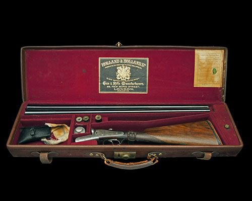28in. nitro barrels, rib gold-inlaid '2' at the breech end, tubes engraved 'HOLLAND & HOLLAND. 98 NEW BOND STREET. LONDON.', 2 1/2in. chambers, bored approx. true cyl. and 1/4 choke, paten gas checks, toplever gold-inlaid '2', automatic safety with gold-inlaid 'SAFE' detail, border engraving, retaining traces of original colour-hardening, 15 1/8in. stock (crack at head) including 3/4in. recoil pad, weight 6lb. 6oz., in its lightweight leather case