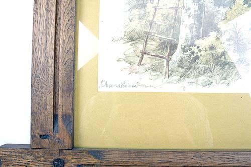 A FRAMED GLAZED PAINTING OF HUNTERS IN AN OBSERVATION POST,
