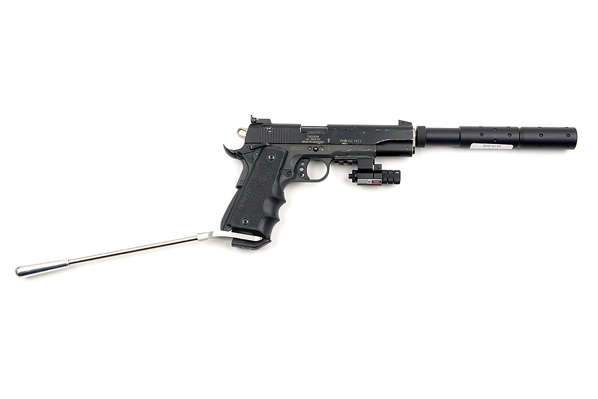 A .22 (L/R) SEMI-AUTOMATIC LONG BARRELLED PISTOL SIGNED 'PRO TSC', MODEL '1911', serial no. 75C0018, with 11 3/4in. barrel including built-on dummy sound-moderator, blacked slide with adjustable sights, blacked frame with grip safe and underslung picatinny rail, soft rubber Hogue grips, detachable magazine with bumper, magazine well with integral lengthened counter-weight and mounted with a laser-sight