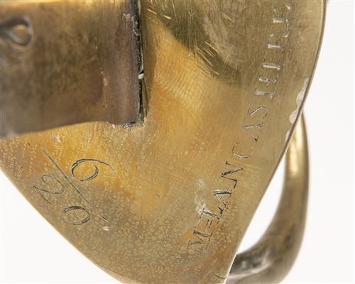 circa 1760, with slightly curved 24in. blade (signs of heavy use, tip re-profiled), heavily struck on both sides with a running fox makers mark bearing the letters 'S.H.' within the body, blind fuller for three quarters of the blade length along the back edge, three bar brass hilt with curved heart-shaped guard , the outer face engraved 'M-LANCASHIRE' and '6' over '20', spiral ribbed solid brass grip and bulbous pommel, no scabbard