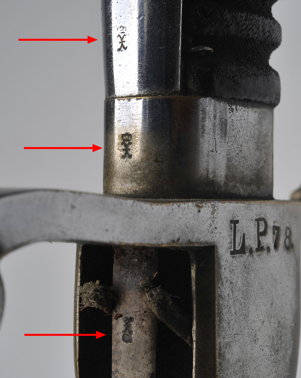 A RARE GERMAN SWORD FOR THE LANDES POLITZEI, serial no. LP78, German East Africa issue, with curving 32in. blade, plain nickel-plated P-shaped hily and ribbed leather grip with wire binding (losses to wire), complete with its matching number scabbard (tight, will not seat fully)