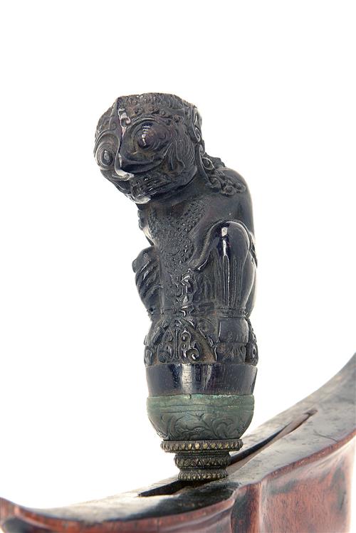 TWO MALAY KRIS KNIVES AND A DYAK SKULL SCRAPER the first for the tourist market, the second 19th century with finely carved ebony hilt and 14in. watered blade (blade worn), the last 16 1/2in. overall with white metal mount and malacca handle , the tip carved with a grotesque (3)