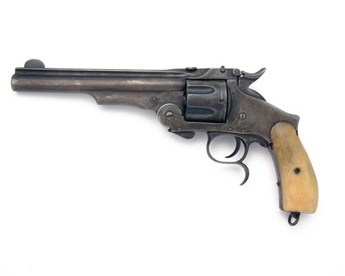 possibly produced under licence circa 1875, with 6 5/8in. barrel, raised sighting rib signed 'RUSSIAN MODEL SMITH & WESSON NEW-YORK' and with a double headed eagle over 'E.B' mark at breech, crescent blade fore-sight, standing notch rear-sight to the lift-up barrel-catch at rear of top-trap, break open frame with auto-ejecting fluted six-shot cylinder, single-action mechanism, smooth bone grips with lanyard swivel at heel, spurred trigger-guard bow and over-size ejection over-ride catch beneath frame