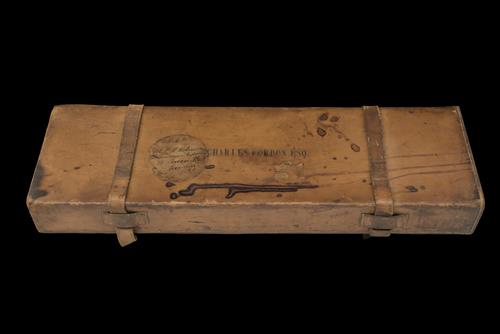 circa 1890, with triple brass reinforced corners, central vacant brass circular escutcheon with coin-milled edge, flush-fitting swinging closure hooks, the interior lined and compartmented in the English manner with green baize and fitted for 30in. barrels, lidded compartment possibly for cartridges and with provision for a pair of turn-screws, a striker removal tool, firing pin pot, cleaning rods and oil bottle (all absent), card 'Dickson' trade-label inside lid, the whole remaining in fine condition and complete with its leather outer slip-case embossed 'CHARLES GORDON ESQ' and bearing a gummed circular paper label hand written (possibly) 'ATT H&H W. MR F.H. ROBINSON, C/O AMERICAN EXPRESS CO, 84 QUEEN STREET, LONDON E.C' and 'FROM (the) GRAND, CARLISLE' together with further remnants of a Carlisle Railway Porters label (cross-straps, end flap and handle all defective, some staining)