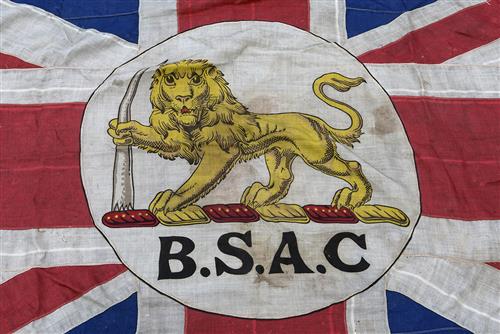 specifically from his Lying in State in Bulawayo in April 1902 and used to drape the coffin, the design being a Union Jack with a central circular 'passant gardant' lion device grasping an elephant's tusk in its outstretched paw above 'B.S.A.C.' (the corporate trademark of the British South Africa Company), measuring 140in. x 68in. approximately, the edges in poor condition but the majority sound, suspension rope to the left hand side.