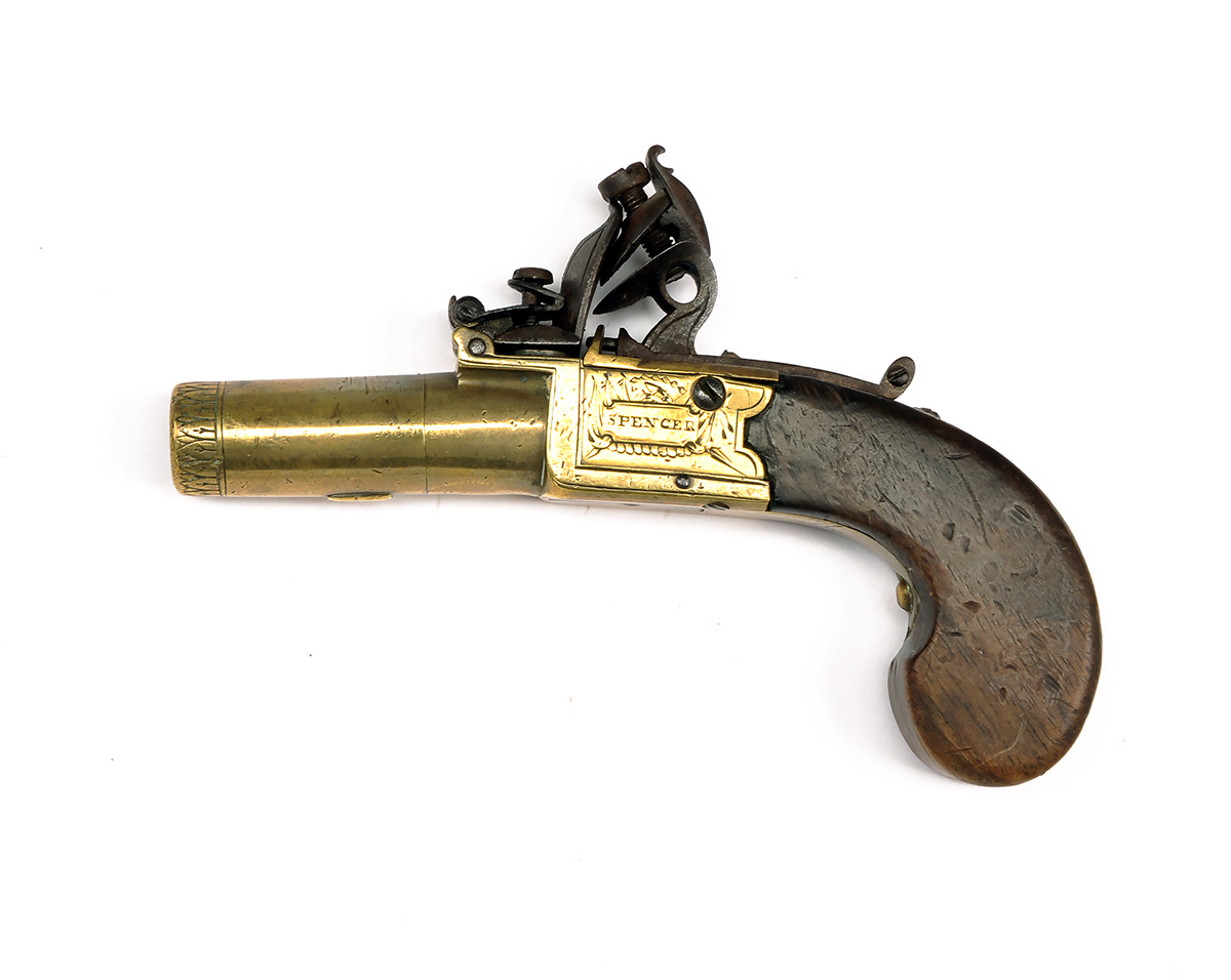 A 25-BORE FLINTLOCK BRASS-BODIED POCKET-PISTOL SIGNED SPENCER, LONDON, no visible serial number,