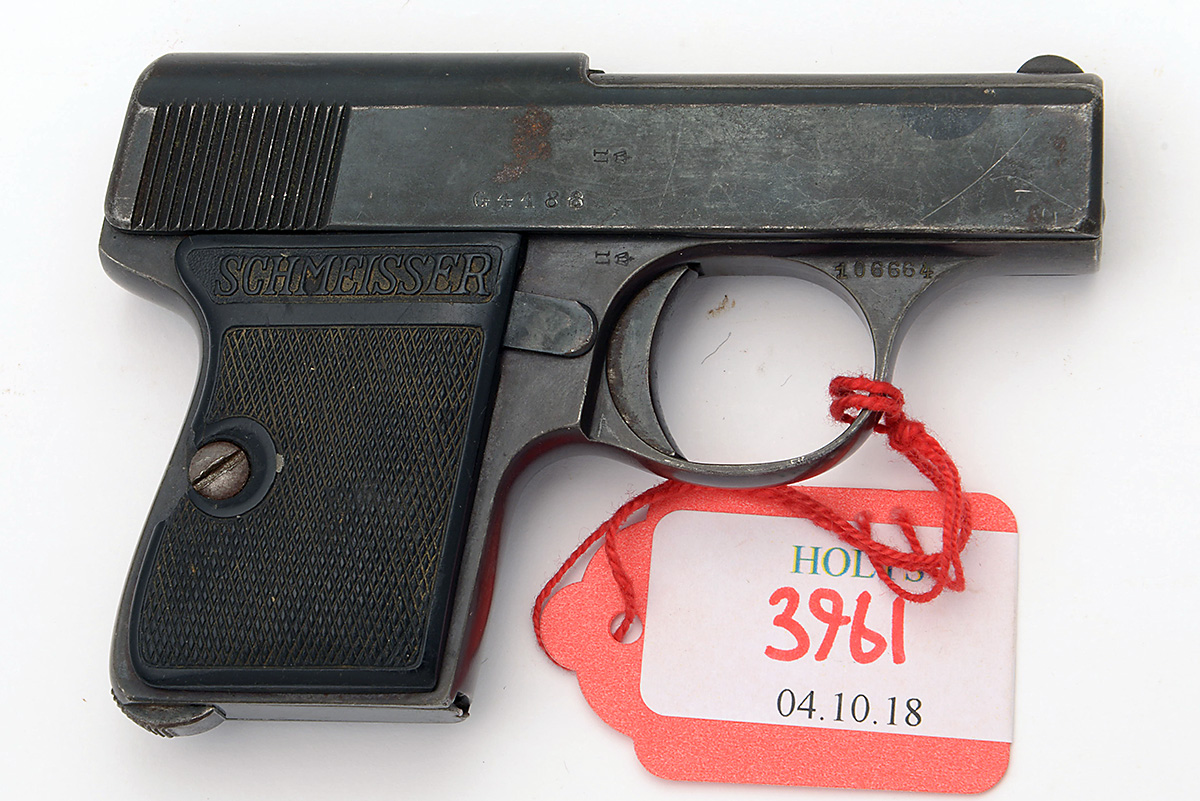** A 6.35mm (.25ACP) SEMI-AUTOMATIC VEST PISTOL SIGNED 'HAENEL', MODEL 'SCHMEISSER'S PATENT MODEL II', serial no. 106664 / G4488, circa 1925, with 2in. barrel, blued slide and frame and black plastic chequered grips