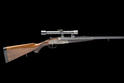 25in. nitro reproved (in 2018) chopperlump barrels (rebored from .240 Apex), finely matted sight rib with open sights and a folding leaf sight with white metal inlaid sight lines and marked 50, 100 and 350, ramp-mounted bead fore-sight, the breech end mounted with a Carl Zeiss Zielvier telescopic sight, serial no. 25871, in its original quickly-detachable mounts, the forward ring engraved 'HOLLAND & HOLLAND 31407', the sunken rib engraved '(.240 BORE)' and a later 'CAL. 7X65R', treble-grip action with hidden third bite and removable striker discs, side-bolsters, bolted automatic safety with gold-inlaid 'SAFE' detail, hand-detachable sidelocks, gold-inlaid cocking-indicators, rolled-edge triggerguard, best bold Royal scroll engraving, the underside with an elaborate cartouche engraved 'ROYAL EJECTOR', retaining traces of original colour-hardening and finish, 14 1/8in. figured pistolgrip stock with cheekpiece, engraved steel pistolgrip-cap (with trap), sling swivels and including 7/8in. rubber recoil pad, weight 7lb. 15oz. (unscoped) and 9lb. (with scope), in its brass-cornered oak and leather case with some accessories and provision for the telescopic sight in its leather case