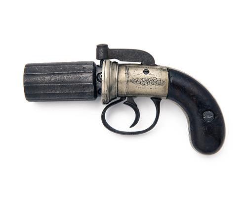 A CASED 100-BORE PERCUSSION SIX-SHOT PEPPERBOX REVOLVER, no visible serial number,