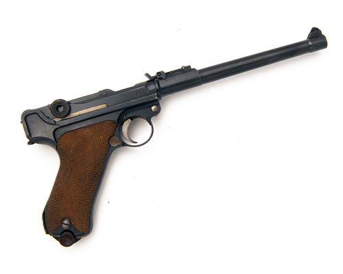 dated for 1918, with blued 18in. barrel, dove-tailed fore-sight, elevating rear-sight without windage adjustment, maker marked blued toggle, blued receiver and frame, much 'straw' finish remaining to ancillaries and complete with its leather holster and matching number stock-board, the holster complete with loading tool and cleaning rod, the whole in fine condition