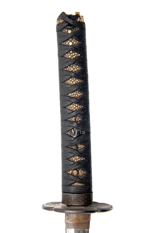 the blade possibly early 18th century, 28in with twin remount holes in the unsigned tang (blade dirty and stained with small edge chips), quatre-lobed moulded signed iron 'tsuba' with precious and other metal inlays, cotton bound rayskin hilt, complete with black lacquered scabbard, some furniture pieces absent