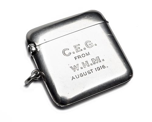 London silver hallmarks for 1913 and with makers mark 'JCV', vesta type case sprung to open to reveal ten numbered flat ivorine pegs, silver gilt interior, the case lip etched 'REG. 476826', and 'R17053', the case outer monogrammed 'C.E.G. FROM W.H.M AUGUST 1916' and hand etched towards the base 'J.C. VICKERY 177 TO 183, REGENT ST. W'