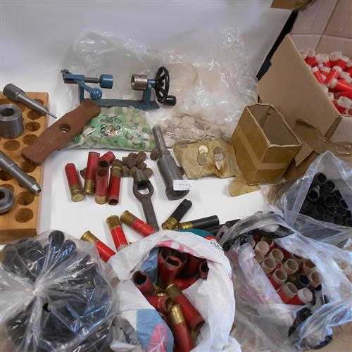 AN 8 BORE RELOADING KIT WITH CASES, WADS, AND EXTENSIVE RANGE OF TOOLS, comprising of a packet of ici cards, a selection of other cards, fibre wads, plastic shot cups, original eley paper cases, plastic cases of three types, re-loading tools include a roll turnover finisher, a wad punch, a decapper, a re-capper with holding tool, two types of re-sizer.