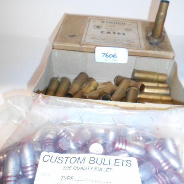 TWENTY .433 REMINGTON EGYPTIAN CARTRIDGE CASES WITH CASE HOLDER AND 200 BULLETS, comprising of an original kynoch carton with.433 rem on the label, a case holder for reloading and 20 primed cases.