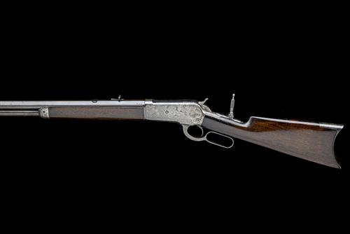 for 1891, with octagonal 26in. barrel signed 'MANUFACTURED BY THE WINCHESTER REPEATING ARMS CO. NEW HAVEN CONN. U.S.A.', dove-tailed nickel bladed fore-sight, elevating buckhorn rear-sight, slab-sided receiver, blued bolt, top-tang fitted with period 'LYMAN' peep-sight, walnut butt-stock with crescent iron heel-plate, iron finger-lever, plain walnut fore-end with iron nose-cap and full-length under-barrel tubular magazine, traces of finish throughout