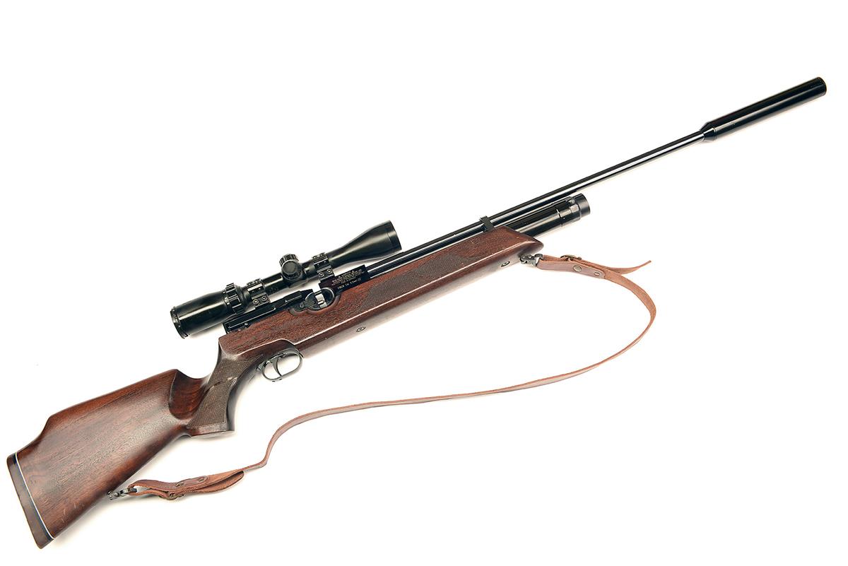 AN FAC-RATED .22 PRECHARGED PNEUMATIC AIR RIFLE SIGNED WEIHRAUCH, MODEL 'HW100 SPORTER', serial no. 1904716, with 31in. barrel including detachable sound moderator, bolt-action repeating mechanism , walnut right hand half-stock , fitted with a 'BUSHNELL 3-9x40 telescopic sight and leather sling, with papers and spare magazine
