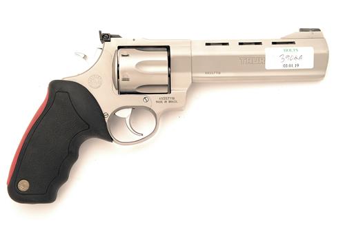 A .44 (MAG) STAINLESS STEEL REVOLVER SIGNED TAURUS, MODEL 'RAGING BULL', serial no. AX557118, with 6in. moulded and ventilated bull-barrel, adjustable sights, swing-out fluted cylinder and soft-rubber stippled grip, complete with a cordura holster for same