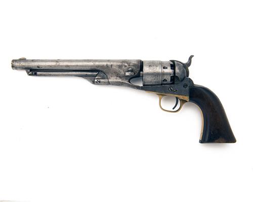 for 1863, with 8in. barrel signed 'ADDRESS COL. SAML COLT, NEW-YORK U.S. AMERICA', stepped cylinder with roll-engraved scene, open iron frame marked 'COLT'S PATENT', brass trigger-guard and iron back-strap, fitted with smooth walnut grips (some chipping at base) and under-barrel creeping rammer, small traces of finish